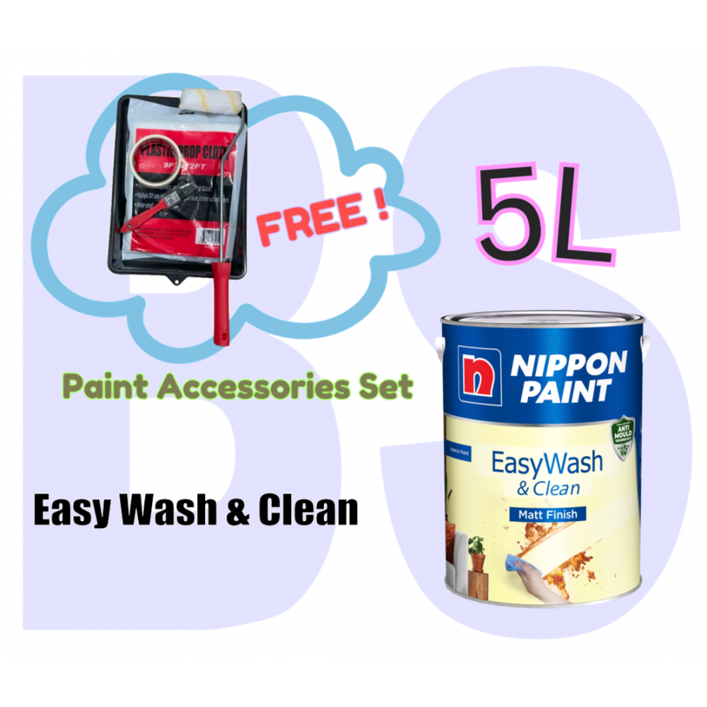 Nippon Easy Wash & Clean Interior Wall Paint. Matt Finish. 5L. Free Paint Accessories Set.