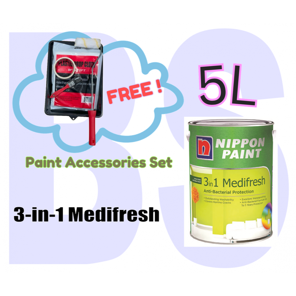 Nippon 3-in-1 Medifresh Interior Wall Paint 5L. Anti-Bacterial Protection. Free Paint Accessories Set.