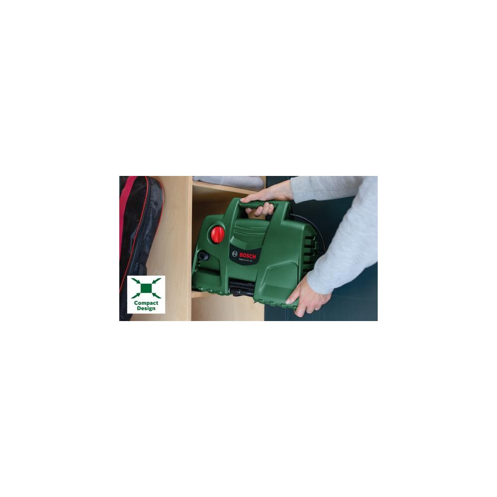 This high-pressure washer is the handy solution for regularly tackling dirty surfaces. The Bosch 360° Gun makes it easy to clean hard-to-reach spaces. One-handed operation provides more freedom and manageability for faster results. Additionally, the fan jet can be adjusted from a powerful jet spray to a gentle rinse, to suit the cleaning task. The EasyAquatak 100 can be used for cleaning cars, waste bins, garden furniture, and windows. It also has a High-Pressure Detergent Nozzle that applies detergent simultaneously with the spray for deep cleaning.