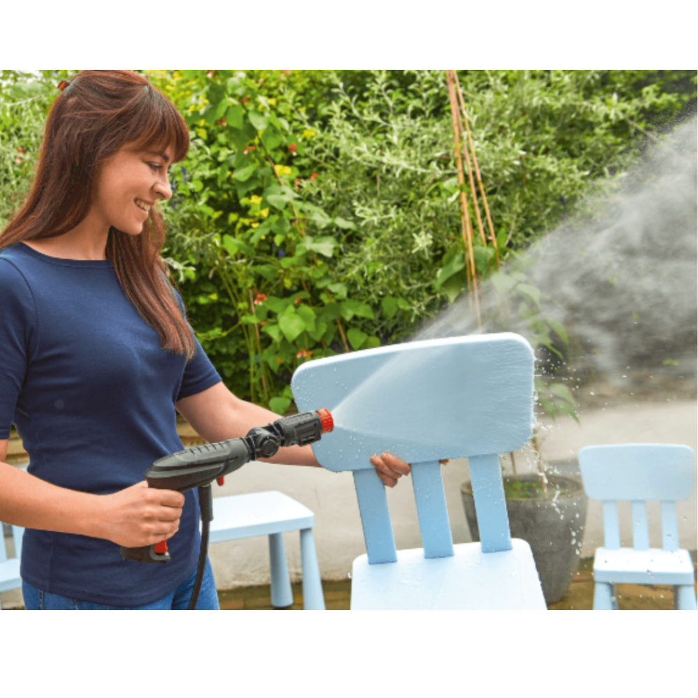 - The nozzle can be adjusted from a forceful cleaning jet to gentle rinsing.