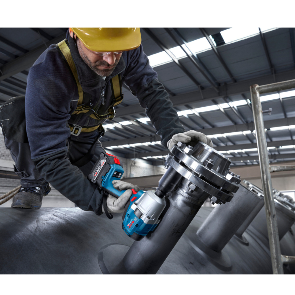 The GDS 18V-780 Professional is your impact wrench of choice when tackling tough work. Thanks to its powerful motor, high tightening torque of 780 Nm, and untightening torque of 1000 Nm, it can even handle bolts as big as M24 with ease. What’s more, weighing in at only 2.1 kg, it is convenient and easy to use. Designed for your comfort, it has a soft grip that feels good, and its compact size and short 170 mm head length make it ideal for working in narrow spaces. Plus, the GDS 18V-780 Professional has a durable and robust ½-inch tool holder with an extra protection ring that protects the coupling and reduces the stress by 20%. And that’s not all, you can use it for many applications thanks to its multiple mode options: turbo mode operates at full speed for tightening big bolts, there’s ABR for untightening bolts, which stops the tool automatically for preventing bolts from dropping