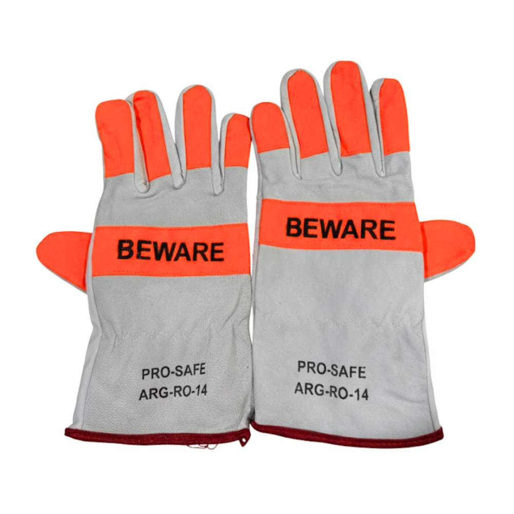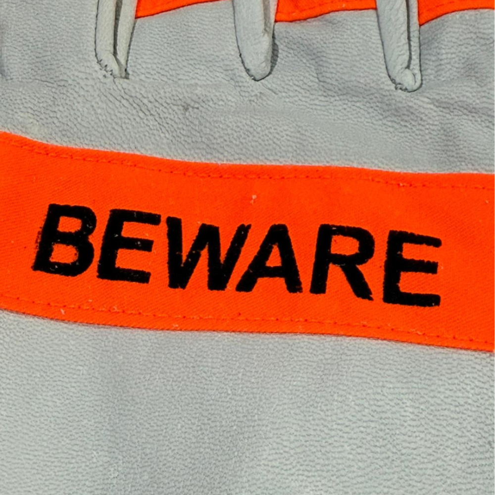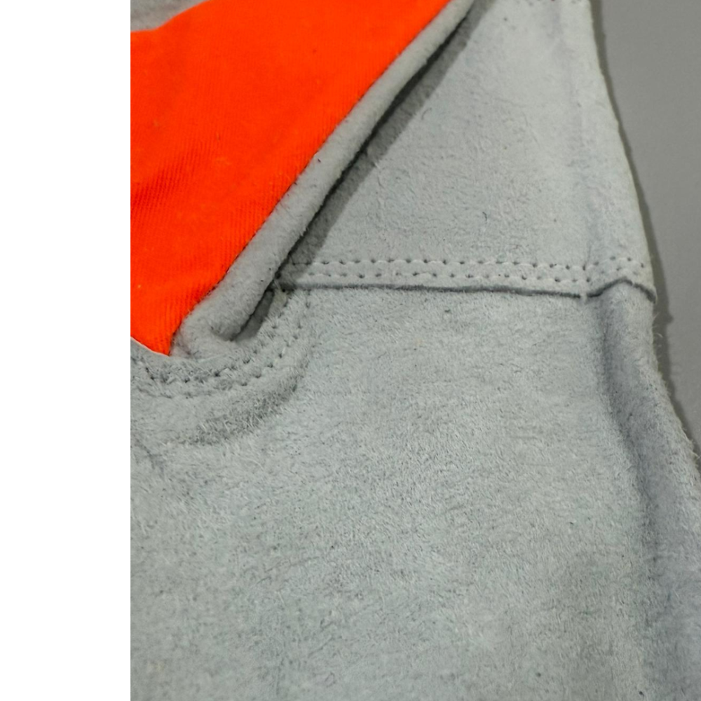 This is a high-visibility safety glove designed for hazardous work environments. It features a durable grey leather body (typical of Argon-style welding or utility gloves) reinforced with bright orange accents on the fingers, thumb, and knuckle strap for maximum visibility.