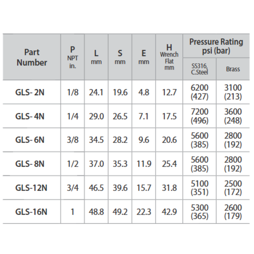 | Part number | P (NPT in.) | L (mm) | S (mm) | E (mm) | H(Wrench Flat mm) |