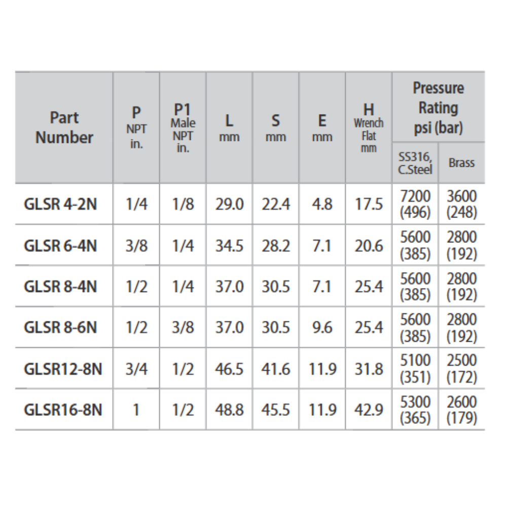 | GLSR 8-6N-B | 1/2 | 3/8 | 37.0 | 30.5 | 9.6 | 25.4 |