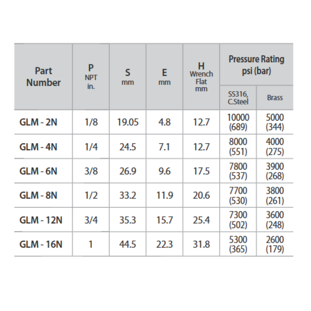 | Part number | P (NPT in.) | S (mm) | E (mm) | H ( Wrench Flat mm) |