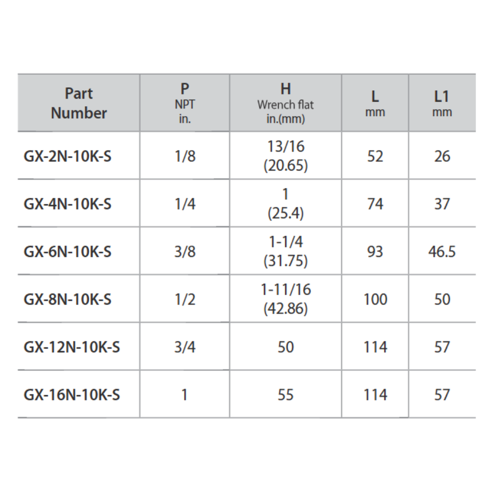 | Part number | P (NPT in.) | L (mm) | L1 (mm) | H ( Wrench Flat mm) |