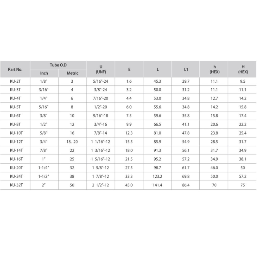 | Part number | Tube O.D (Inch) | Tube O.D (Metric) |